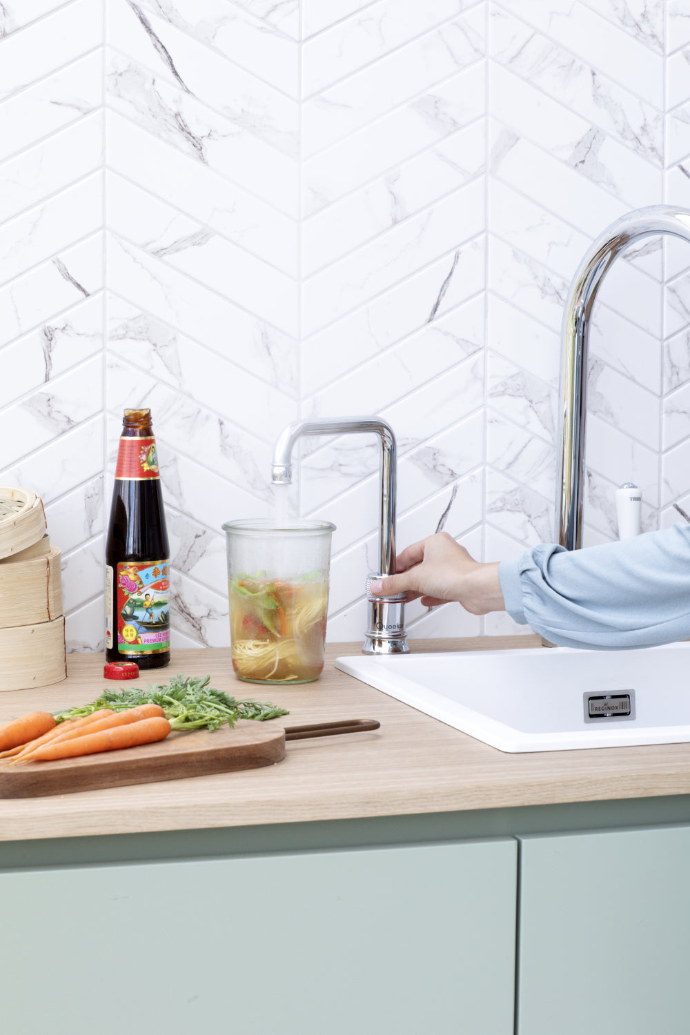 Met de Quooker CUBE tap je gekoeld en bruisend water direct uit de kraan. Dit bespaart energie (en ruimte), omdat je geen losse apparaten zoals een sodastream of flessenkoelkast meer hoeft te gebruiken.
